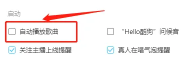 在右侧选项中,找到【启动】模块,用鼠标左击【自动播放歌曲】对应的小框,取消框内的√即可,如图所示。