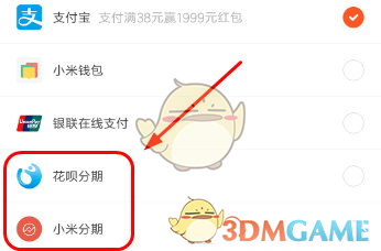 2、在支付界面,下拉屏幕,你可以看到支付方式*下方有花呗分期和小米分期两种分期模式。