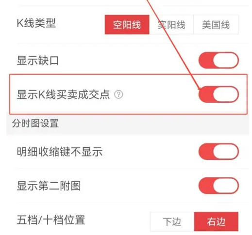 滑动页面里的【显示K线买卖成交点】右侧开关开启即可!