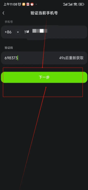 在跳转的新界面中输入原来的手机号和验证码后,点击“下一步”