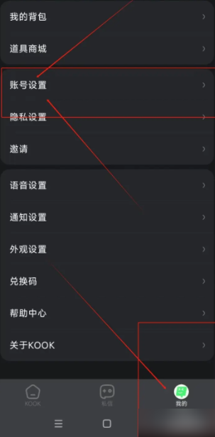打开kook App,在主界面点击右下角的“我的”,在我的界面中点击“账号设置”