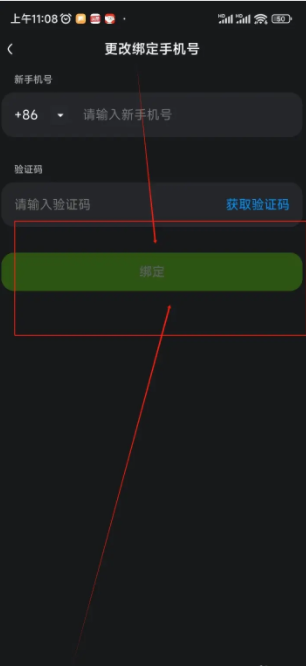 在弹出的新界面中输入新的手机号和验证码后,点击“绑定”,即可完成更换绑定手机号的操作