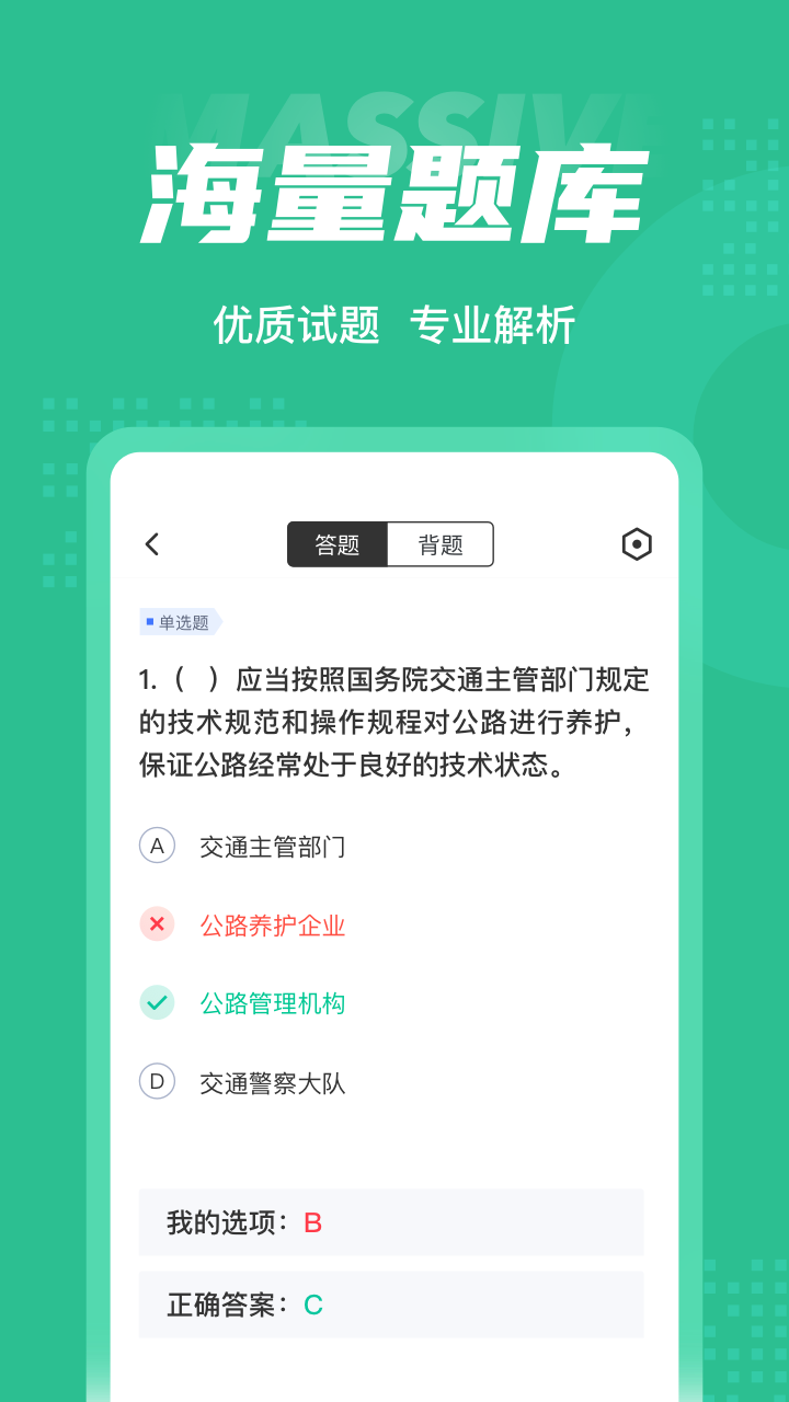公路养护工聚题库app是一款专为公路养护行业人员设计的教育类应用,旨在帮助用户备考公路养护相关的职业资格考试。该应用提供了丰富的题库资源,涵盖了所有相关知识点,并配有模拟考试和错题集功能,助力用户提升应试能力。界面设计简洁,操作方便,适合广大公路养护工及相关从业人员使用,是备考过程中不可或缺的得力助手。