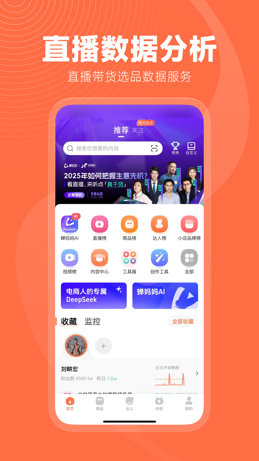 蝉妈妈,一般又称蝉妈妈直播数据app,婵妈妈app。蝉妈妈AI,你的专属电商顾问,接入满血版DeepSeek-R1。抖音电商直播视频带货数据服务商,抖音数据查询分析实时准确。注册免费用企业版会员,APP续费更优惠,4.7折起!抖店商家移动工作台,抖店运营技巧。商品热度分析、视频提取、审词大师、提词器等工具免费使用。众多行业top达人推荐“做内容电商,找蝉妈妈”,短视频带货选品,巨量引擎创意星图抖加Dou+投放策略专业数据分析平台。