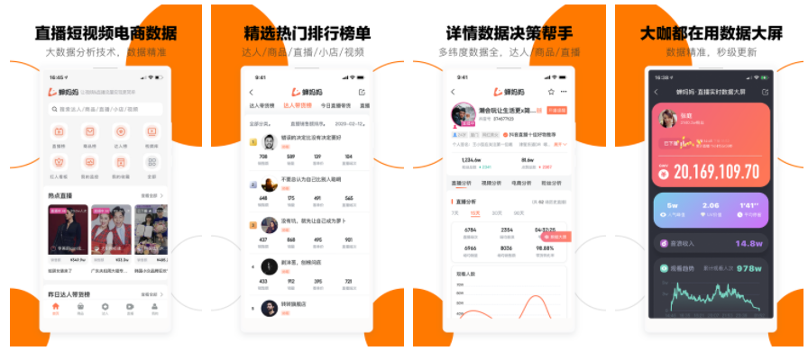【蝉妈妈数据】产品优势-快速发现热门直播间,提供直播实时数据大屏。 -发掘爆款商品,提供达人带货榜单,抖音小店抖店小黄车销售数据榜单。-分析各行业数据流量趋势,定位账号内容,发掘优质直播带货达人主播。-依托专业的大数据挖掘能力,构建多维数据分析。为网红达人主播、MCN机构、抖店抖音小店达多多淘宝阿里巴巴1688商家卖家飞瓜轻抖用户提供抖音直播电商精选联盟深度整合一站式数字营销服务。