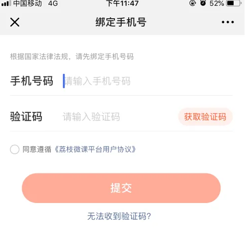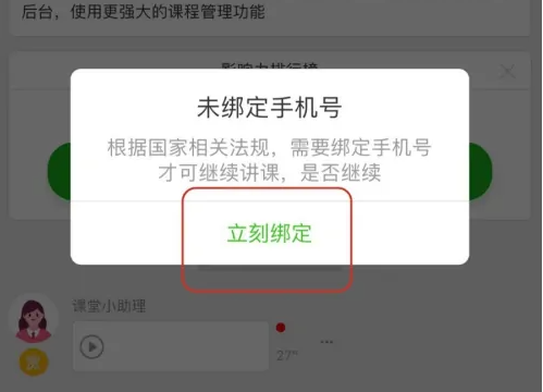 进入直播课内,*开课还需要绑定手机号,点击【立即绑定】按钮。并输入手机号码获取验证码进行绑定。