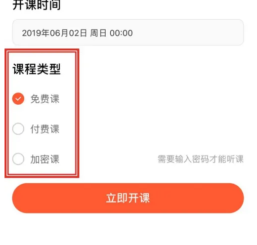 进入创建课程页面,默认是直播课,设置课程时间,选择你的课程类型,可以选择“免费课“”付费课”“加密课”三种类型,点击【立即开课】创建课程。
