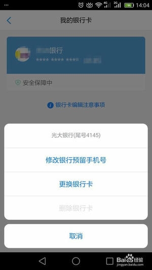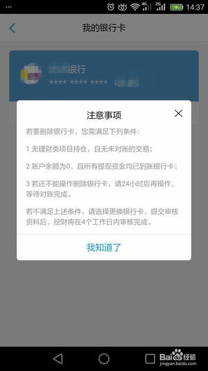 进入“我的银行卡”界面,里面就会显示你所添加过得银行卡;点击你要删除的银行卡,在出来的界面里面点击“删除银行卡”;再依照步骤即可完成。