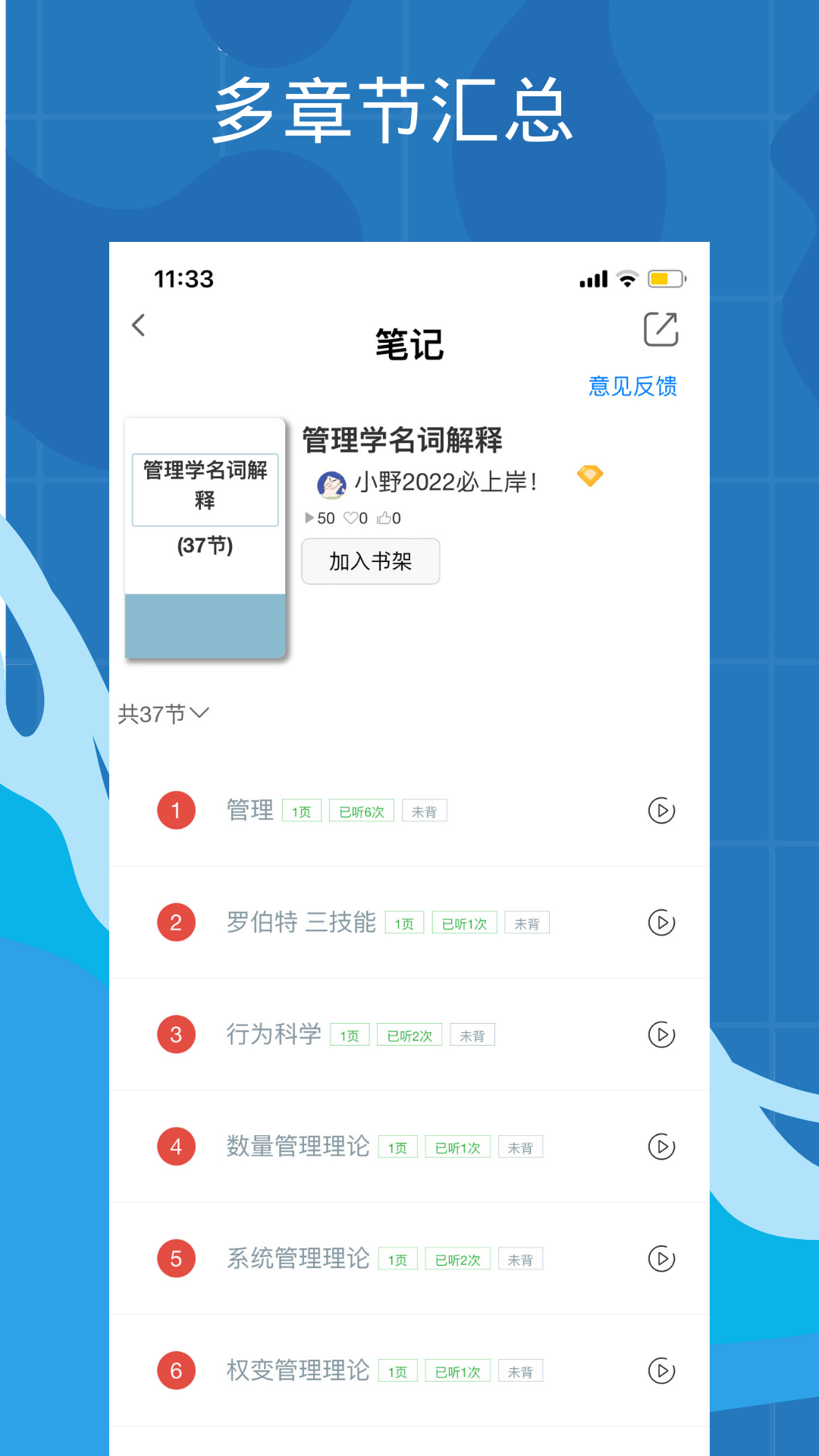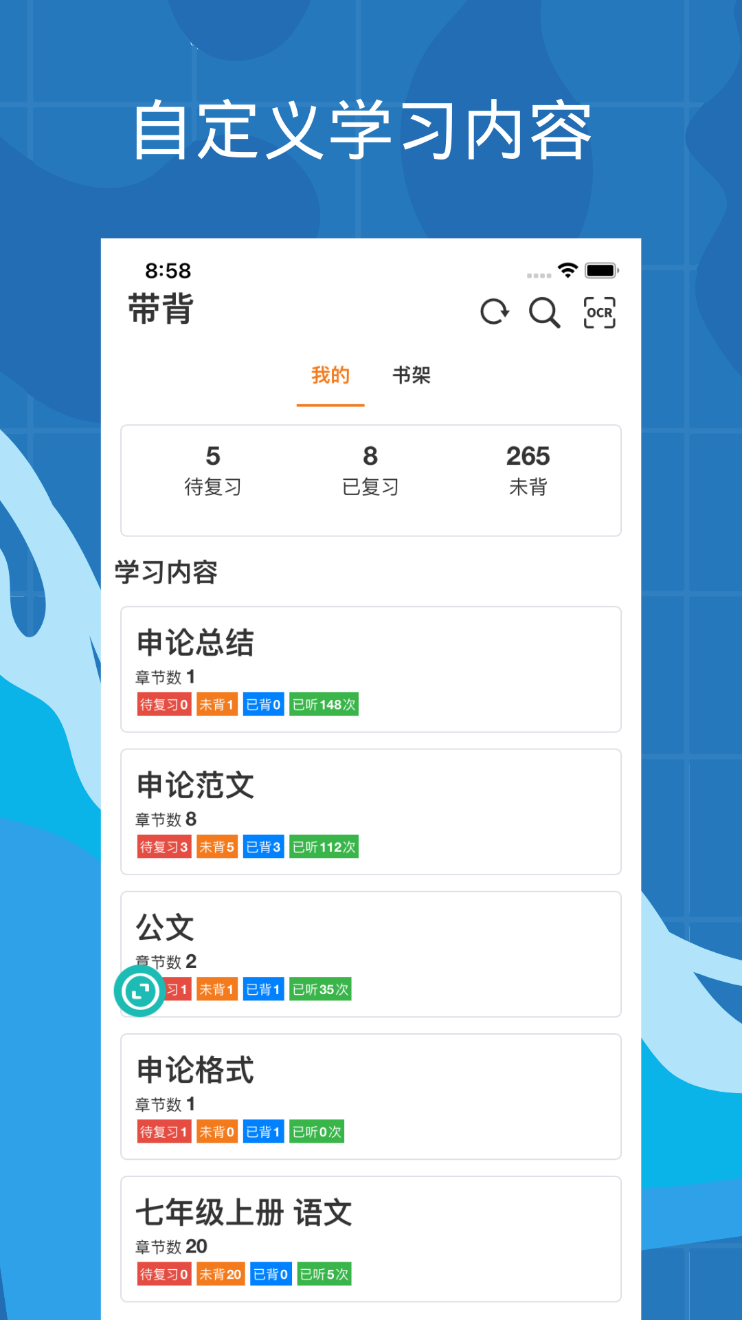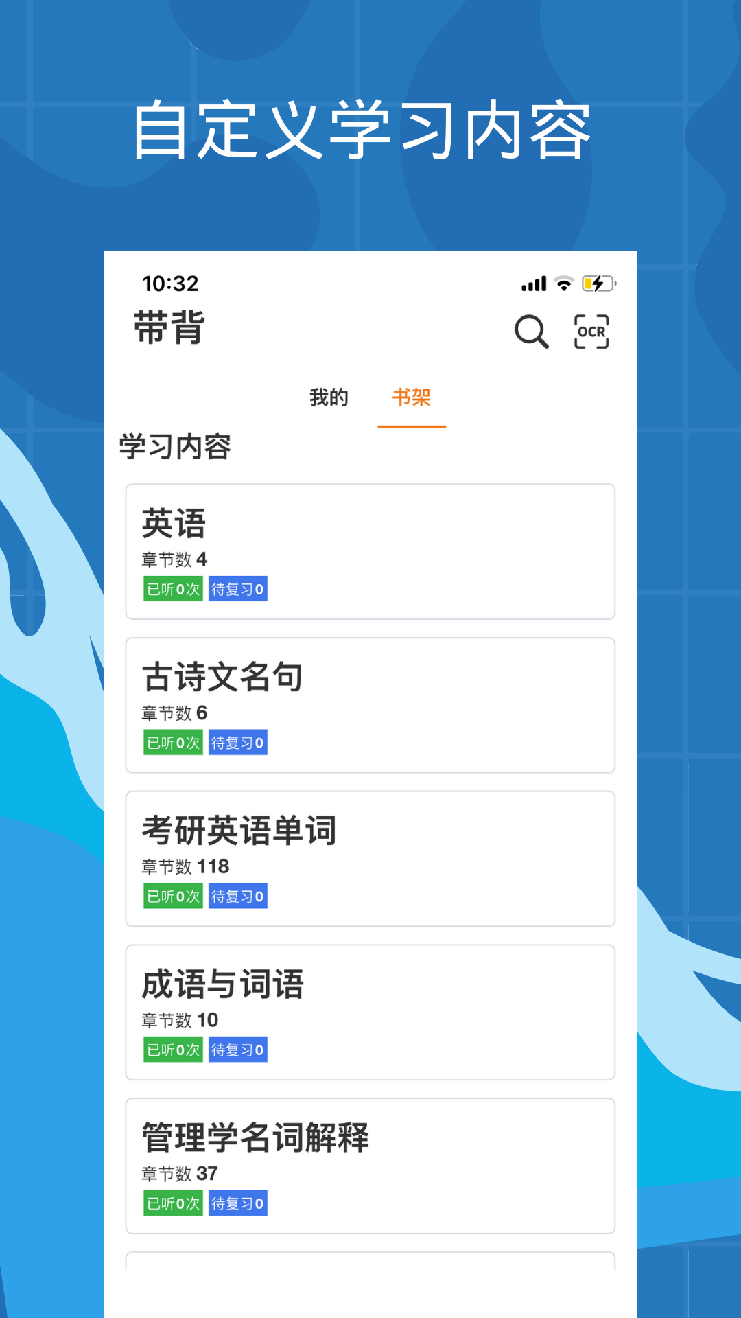 带背,创新语音带背模式,语音文字结合,文字自动翻页,自动循环章节,眼耳并用专注刷题,效率倍升。语音带背模式能够充分利用闲暇,锁屏依然可以播放,让眼睛放松一下。无数用户的选择,公考,事业单位考试,教师,司法,建造师,考研好帮手,轻松背诵!