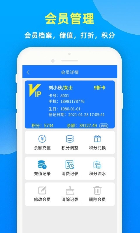会员管理:会员、积分、折扣、消费统计。