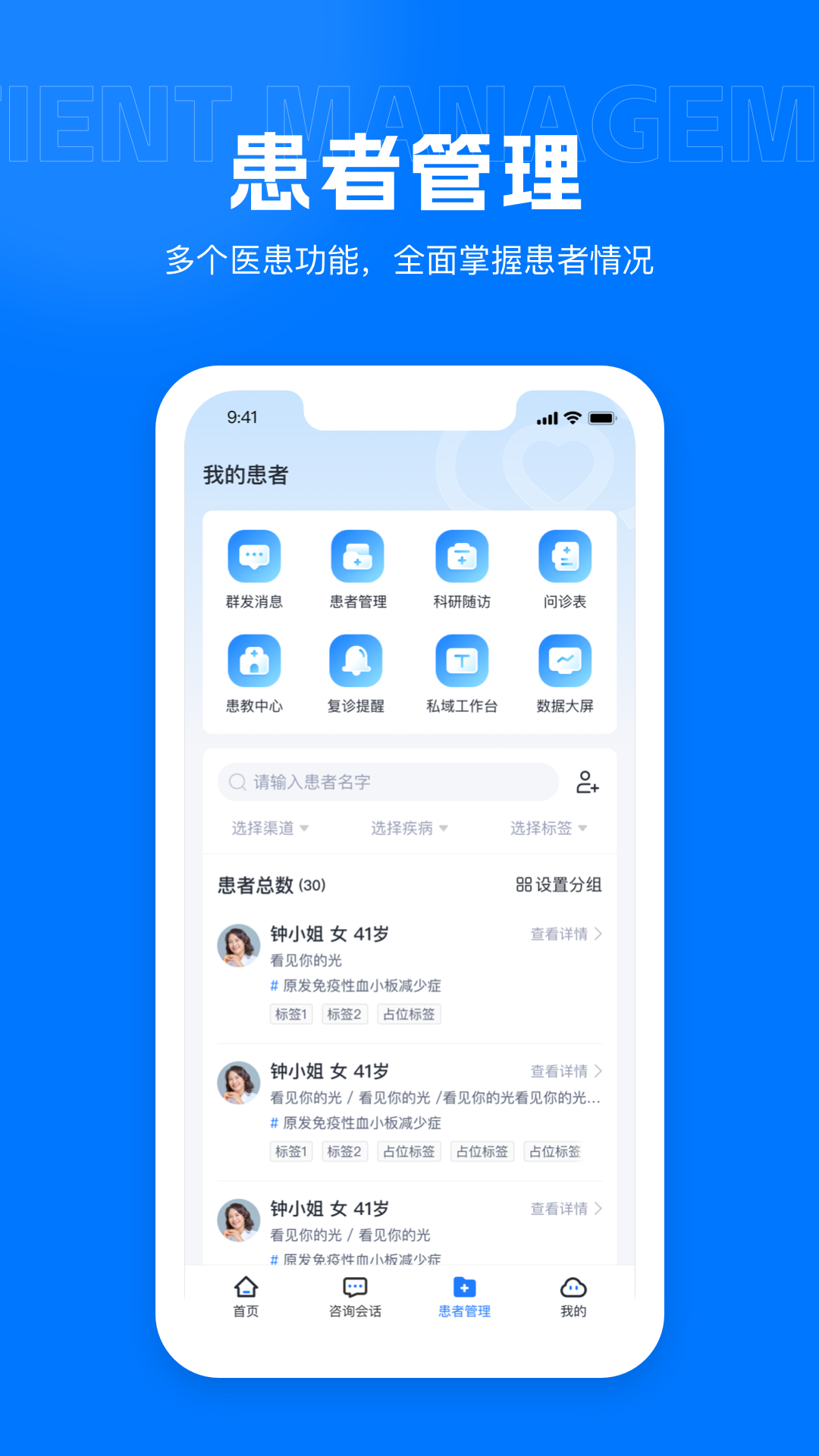 软件的主要功能:医生团队、患者管理、咨询会话、患教中心、科研随访、数据大屏等