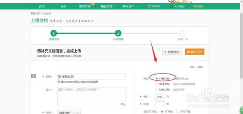 4.选择你要上传文档的性质,这里选择“付费文档”要想上传付费文档必须要通过百度文库的认证,否则没法上传付费文档