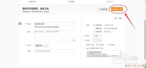 8.所有的东西设置完成,现在就完成了文档的设置,单击“确认上传”现在就完成了文档的上传工作,等待系统审核,审核通过的话就可以在文库展示了。