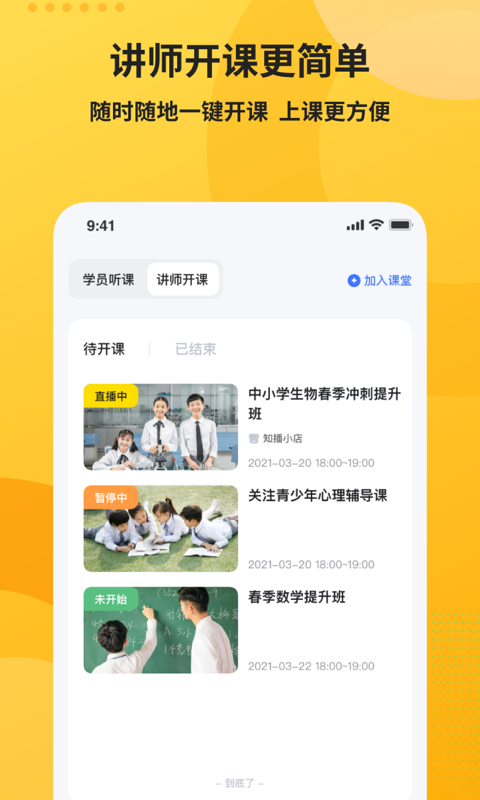 在知播,你仅需一分钟即可创建属于自己的在线课堂,从此告别服务器购买,也不用为维护硬件支付额外成本,更不用招募研发团队进行产品设计和开发;