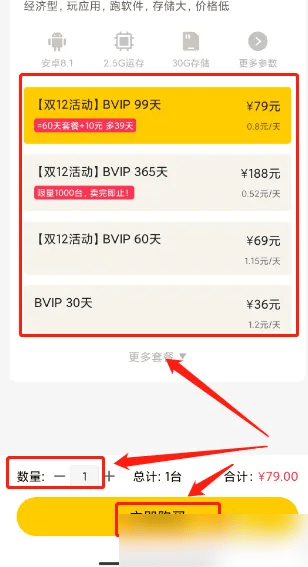进入购买云手机选择套餐、购买数量,点击(立即购买)选项。