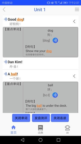 不一样的点读软件,涵盖小学英语,初中英语的点读,孩子可以正常语速播放,也可放慢语速播放;其中的,单词知识点记忆及互动练习,竞技答题,挑战学霸,跟读口语的AI智能测评等。