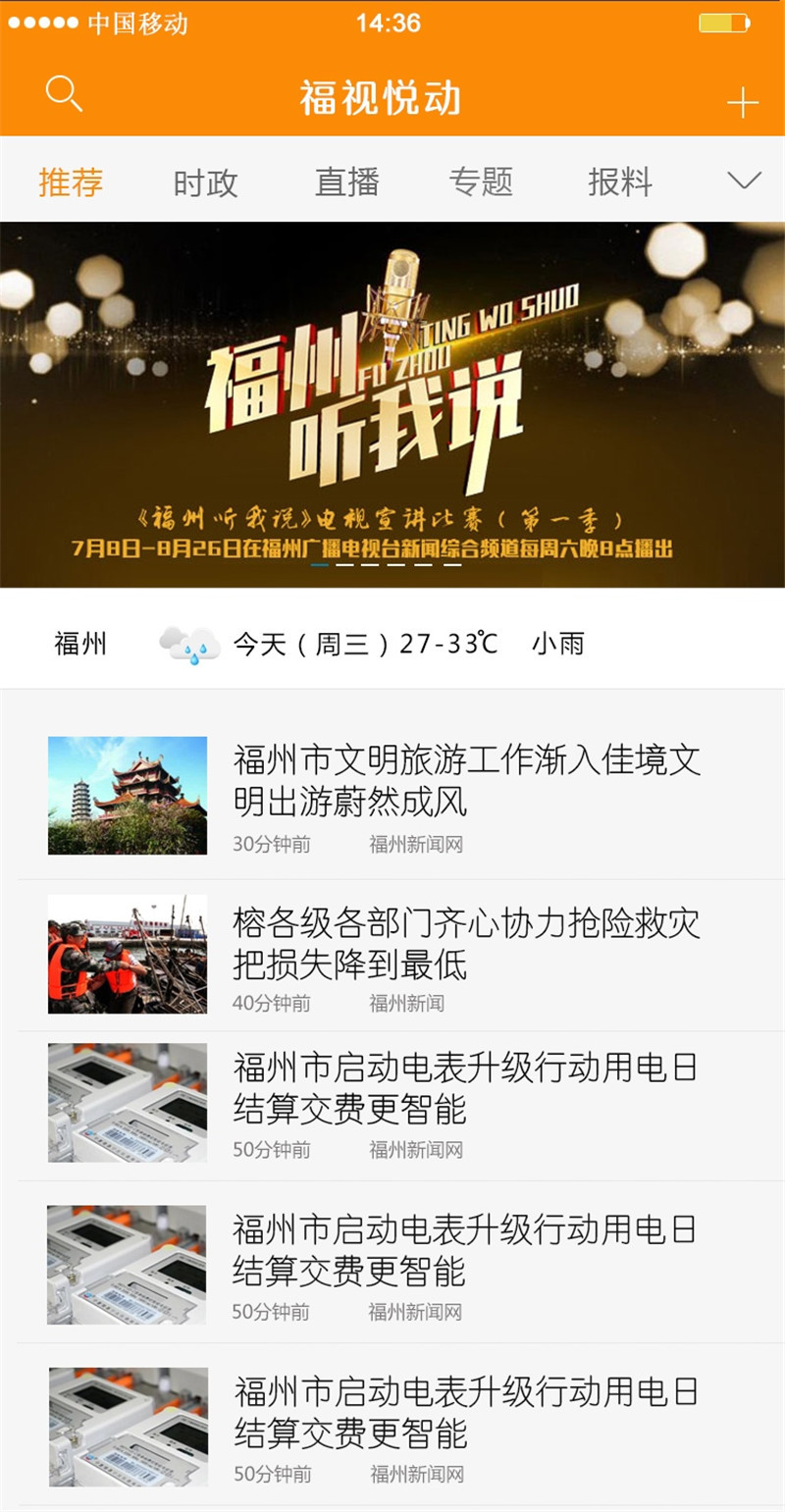 为福州电视台打造的一款集电视直播 图文资讯 新闻点播 影视播放 生活服务 多屏互动 现场报道等功能为一体的新媒体手机app