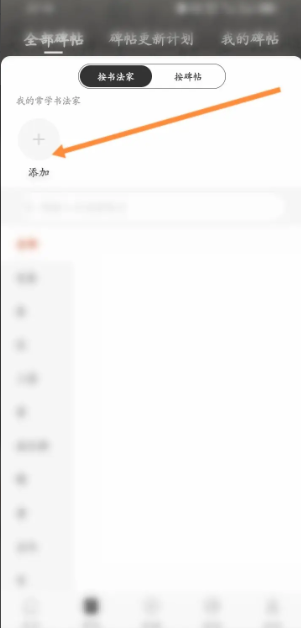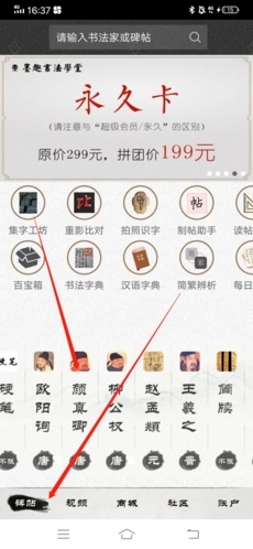 1、进入APP后,首先在左下方的“碑帖”中点击一位书法家;