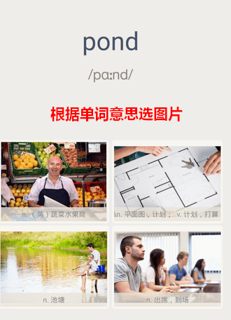 第二种题型是由单词选图片。也就是说,根据单词的意思,在下方的图片中点选一个进行匹配。
