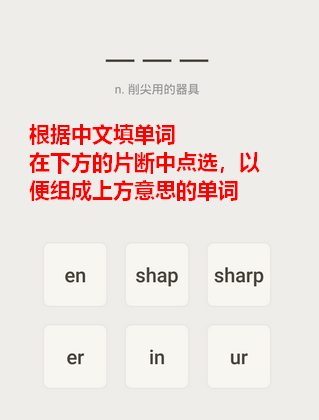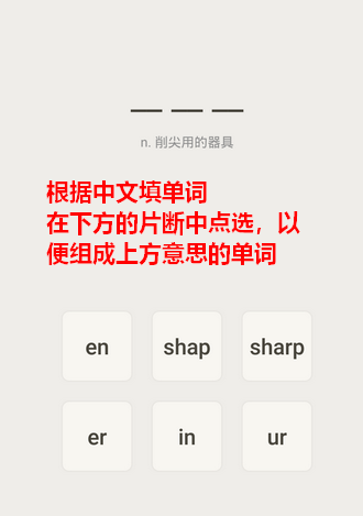 还有一种题型是由中文填单词。和普通的默写单词不同,为了降低难度,它会给出一些近似的单词片断,让你将它们拼接起来。