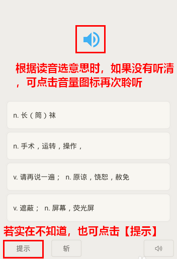 在查找中文释义的过程中,如果你一时半会没有听清单词的发音,也可以点击音量图标再次聆听。当然,如果你实在听不出来,则可以点击左下角的“提示”。