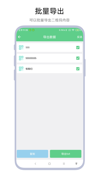 1.支持批量扫描二维码;2.支持识别相册二维码;3.支持批量导出识别结果;4.支持生成二维码和条形码;