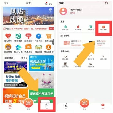 1.打开天津地铁app,在“我的”中可以找到“电子发票”入口,点击进入电子发票界面。