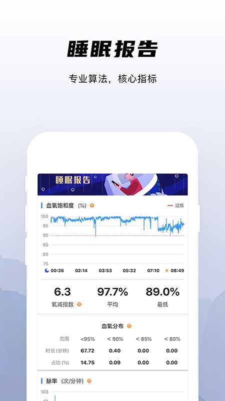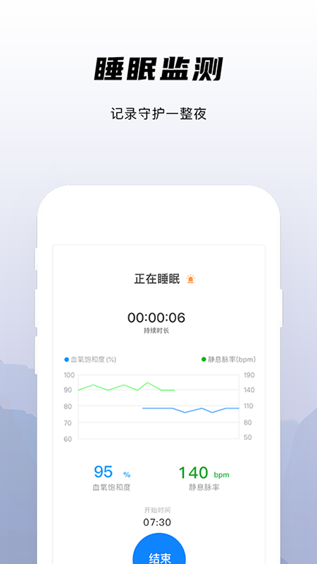 配合兆观公司脉搏血氧检测仪监测用户静态的血氧和脉率。可以输出实时监测值,同时也可整晚监测,形成分析报告。根据相似体征人群计算,数据更准确。让用户充分了解自己的身体状况,引导健康的生活方式。APP通过蓝牙与脉搏血氧检测仪绑定连接和操作。结束监测后自动生成报告,方便用户查看