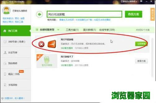 2、然后,在上方查找方案的搜索框中输入“风行加速器无法卸载”,搜索问题的解决方案;