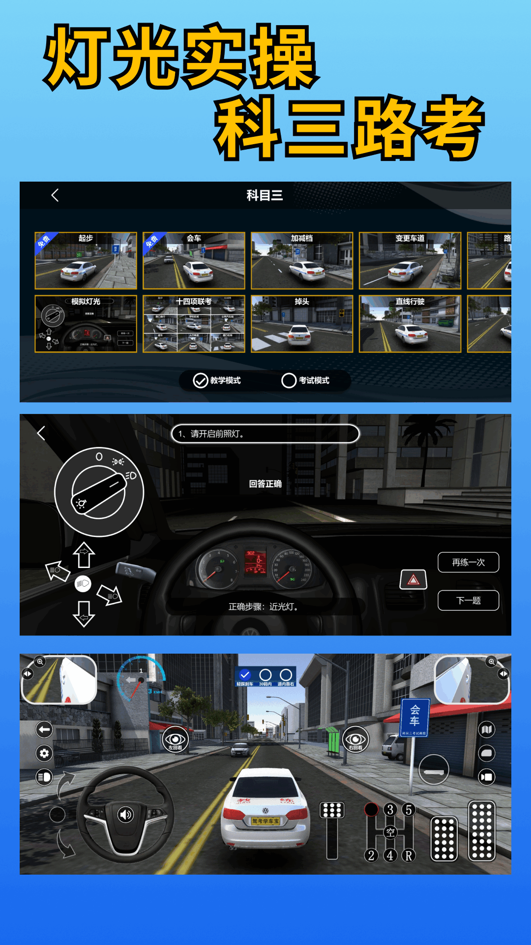 3、科目三驾考模拟:包含灯光模拟、起步、会车、掉头、变更车道等15项练习项目,更有十四项联考模拟驾考全流程考试。
