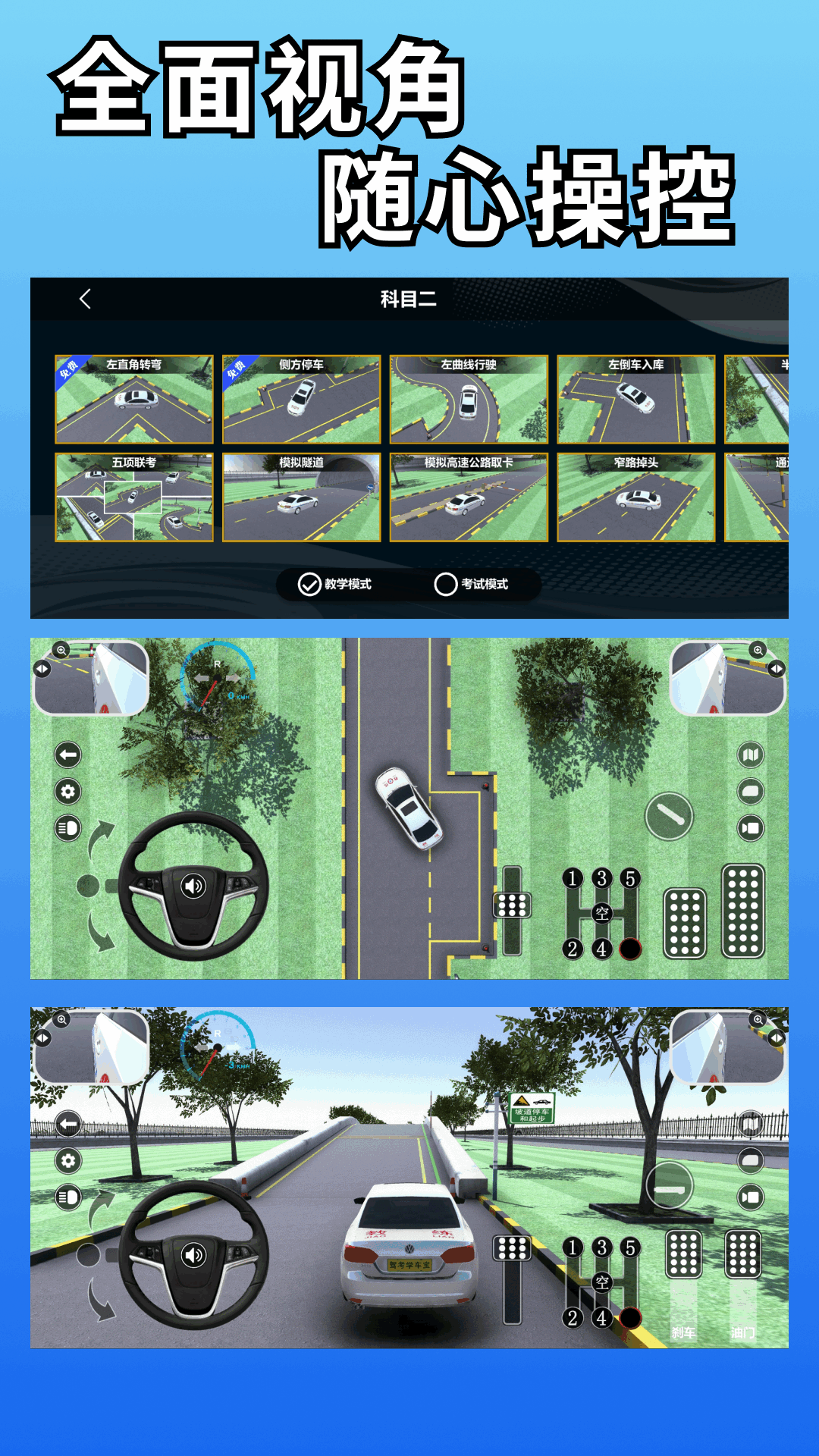 2、科目二驾考模拟:包含科目二直角转弯、曲线行驶、定点停车、侧方停车及倒车入库五项目,更有五项联考模拟驾考全流程考试。