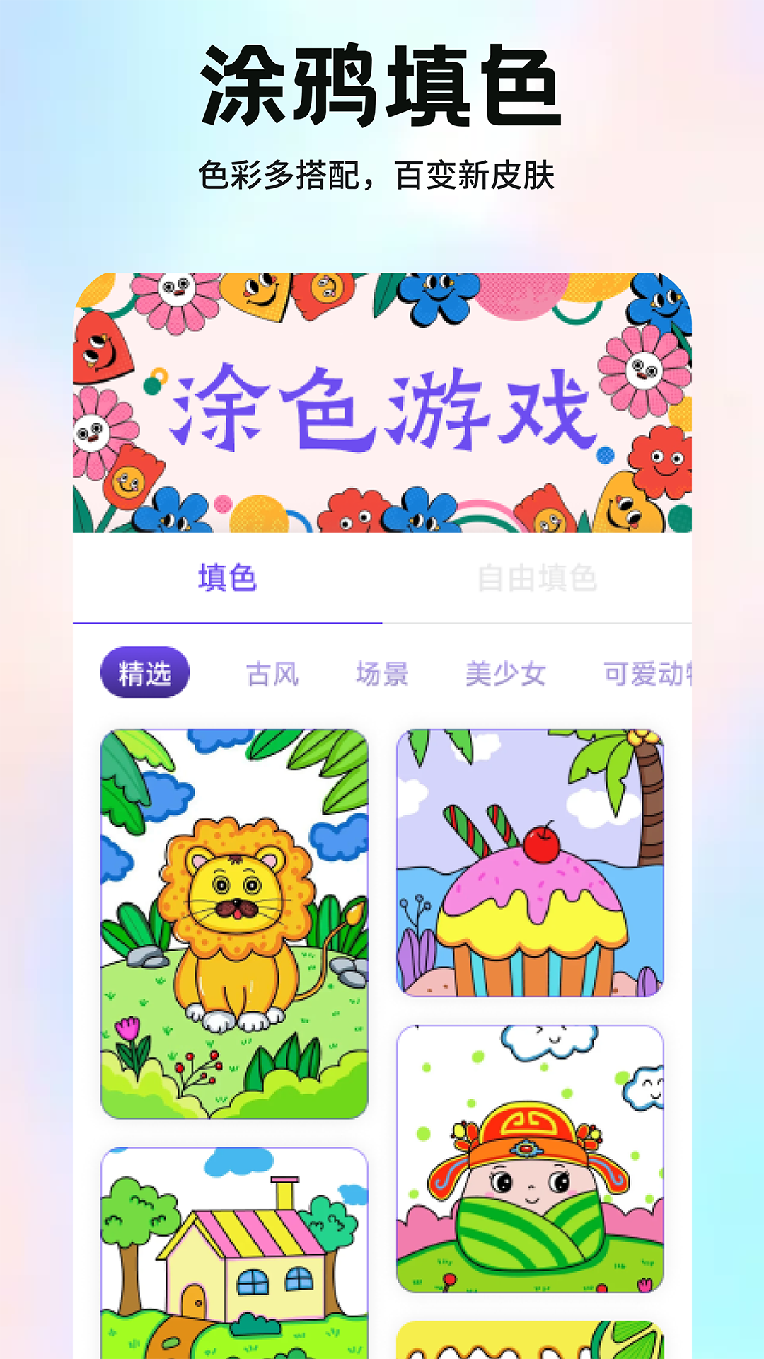 色区填色提供了大量精美的填色图案,包括动物、风景、人物等,满足用户不同的艺术需求,让每次涂色都充满新鲜感。