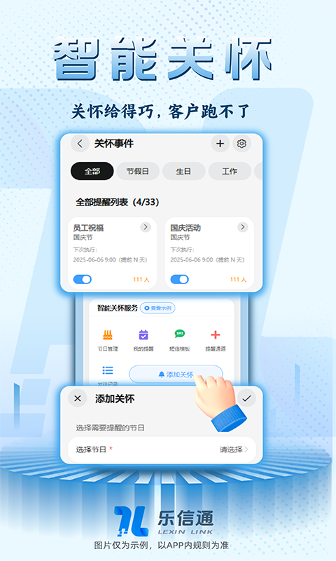 - 智能关怀服务,涵盖节假日、生日及自定义纪念日提醒等,助您更好地维护客户关系,增强客户忠诚度;