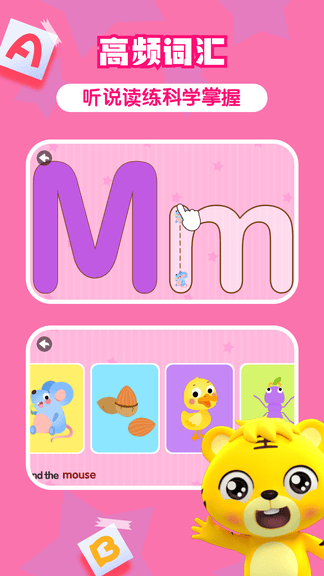 APP中将字母描红和发音练习、趣味动画有效地结合起来,让枯燥的字母书写不再乏味。