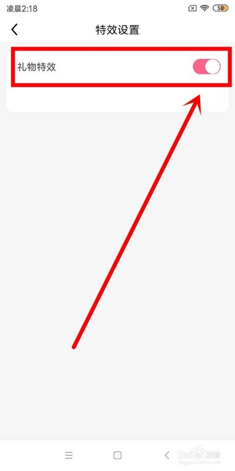进入到特效设置这个页面中之后,在该页面中我们找到礼物特效这个选项,点击该选项右侧的开关按钮,即可打开该功能。