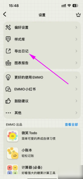首先,打开EMMO,在首页点击【...】图标按钮。然后,在打开的页面,点击【导出日记】按钮。最后,在打开的页面,选择要导出日记的月份,点击【√】即可。