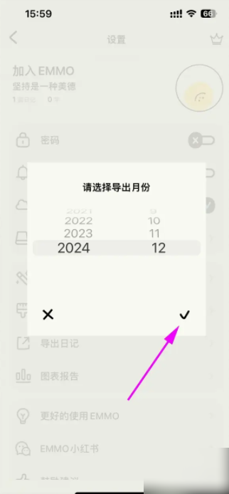 最后,在打开的页面,选择要导出日记的月份,点击【√】即可。