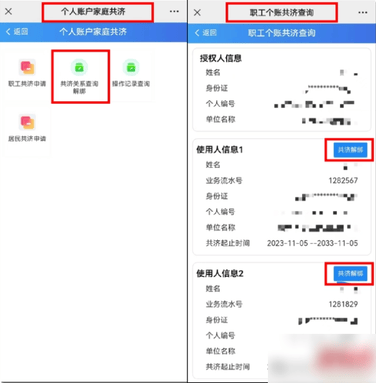 参保职工在个人账户家庭共济管理页面,可查询绑定的近亲属账户信息。如需要解除绑定关系,参保职工可点击“共济关系查询解绑”进行解绑操作。同一人反复被绑定、解绑,仍然只使用1个共济名额。参保职工一生中可累计授权共济20人。