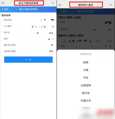参保职工在业务办理板块点击“更多”,在“经办业务”区域点击“家庭共济”,进入“个人账户家庭共济”功能。点击“职工共济申请”按钮,进入绑定近亲属信息填写页面。(原新农合和2019年以前的居民医保设有“家庭账户”,如果有剩余资金可点击“居民共济申请”,也可实现相应功能。)