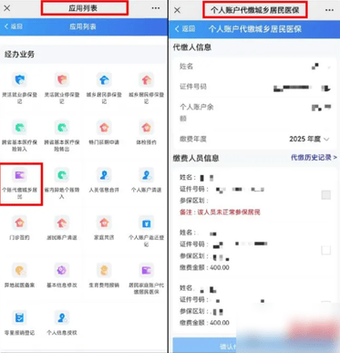 家庭共济设置好后,在平台主页的业务办理板块点击“更多”,在“经办业务”区域点击“个账代缴城乡居民(医保费)”,然后页面上会自动显示共济对象(缴费人员)信息,勾选拟缴费人员,就可以使用授权人的个账代缴近亲属的居民医保费了。