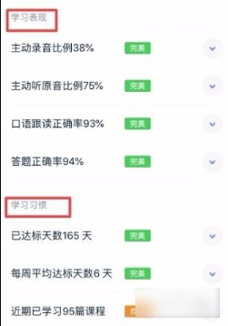 主动录音和主动听原音(25%以上为完美):需要在学习过程中,主动的点击小喇叭和话筒按钮进行主动听和主动录音,就可以提高相对应的比例。