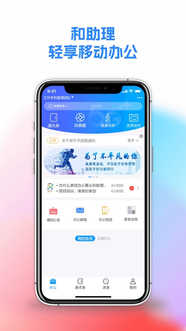 和助理以即时通信为基础,提供考勤、工作审批等办公轻应用,面向不同行业、不同企业提供差异化办公解决方案。