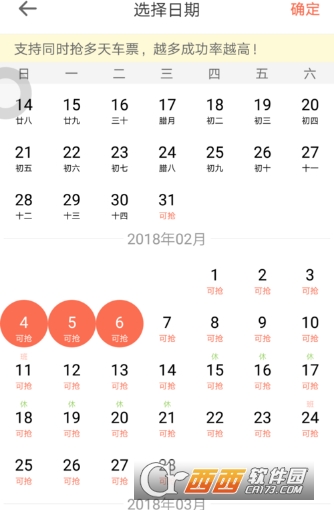 4.填写好出发站和终点站,点击出发日期,选择抢那一天的票,注意一般只等抢三天相邻的票,当然你也可以再开一个抢票