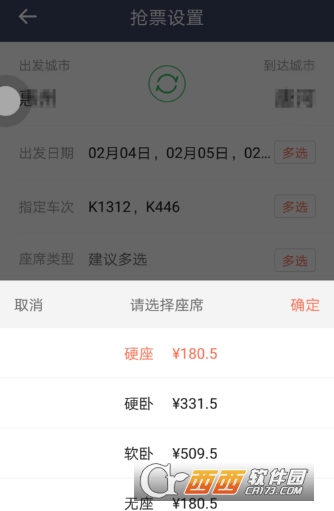 点击坐席类型,选择硬座,卧铺,硬卧等;