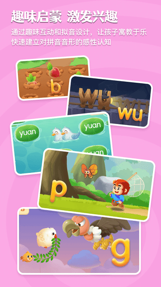 互动游戏: 47个专属趣味互动,让拼音学习变得更容易,更有趣。