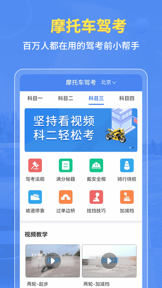 摩托车驾考APP涵盖科目一科目四全套题库,科目二科目三路考视频教学。摩托车驾照考试就选:摩托车驾考!