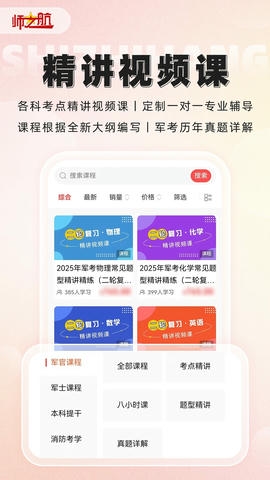 师之航军考 app提供丰富的学习资料,包括最新的军考资讯、教材、视频讲解和历年真题,帮助考生系统复习和掌握考试内容。