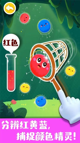 出发去捕捉颜色小精灵啦!宝宝需要根据提示,捕捉相应的颜色小精灵。如果宝宝捕捉到正确的小精灵,会出现对应颜色名称的语音提示,比如“黄色”,帮助宝宝了解颜色名称!(认知颜色)