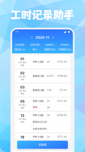 记加班、记请假、核算每月工资更高效! 上班日常管理,可以排班和调休等计划,计算加班工资,让每天的努力辛劳绝不白费! 添加生活备忘录事项,记录提醒不同日期下需要做的事情!
