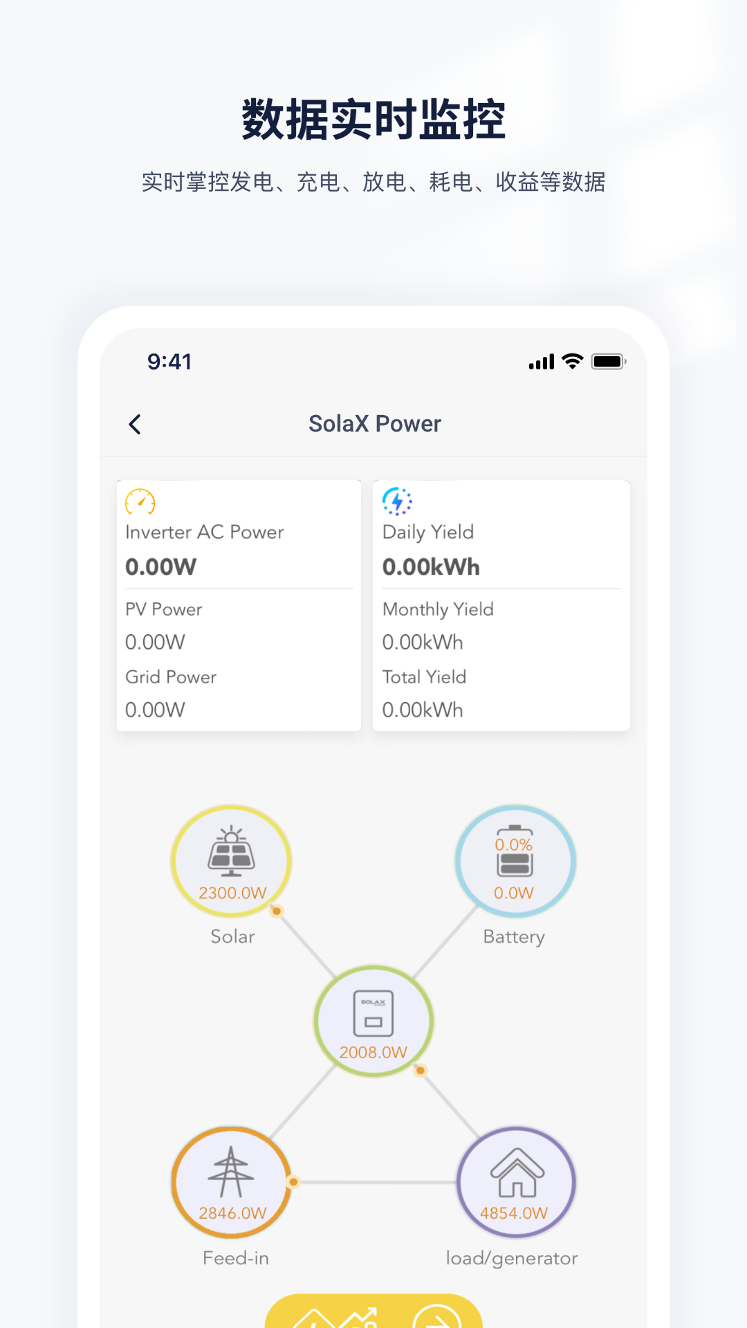 艾罗云APP应用程序由SolaX Power开发,仅用于在SOLAX CLOUD平台上运行的设备。它是一款监控应用程序,使终端用户和代理能够借助云数据分析随时检查电站的用电情况、电池状态及充放电情况、逆变器状态、负载消耗和输出能量等信息。